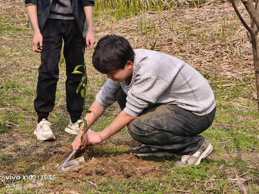 “植”此青绿,共“树”未来。同学们协同配合,栽苗、培土、浇水,每一道工序都一丝不苟。湿润的泥香混着青草气息漫溢开来,种树如育人,根系要深、枝干要直,就像精密零件组成完整机器,每棵树都是生态系统的“关键部件”,这次活动让同学们体会到专业学习与生态保护的深层联系。