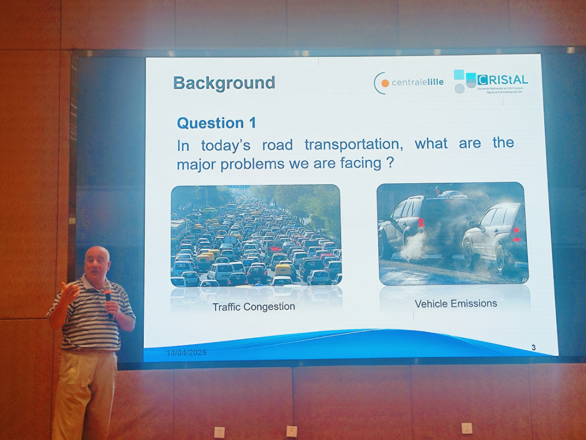 A. EL KAMEL教授首先介绍了智能交通系统(ITS)的背景和关键方面。他指出,当前道路交通面临诸多挑战,如交通拥堵和车辆排放问题。这些问题不仅影响交通效率,还对环境和人类健康造成负面影响。他强调,通过智能交通系统的控制与优化,可以有效缓解这些问题。