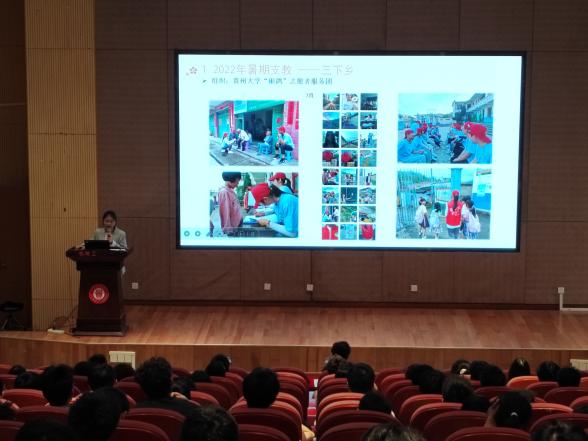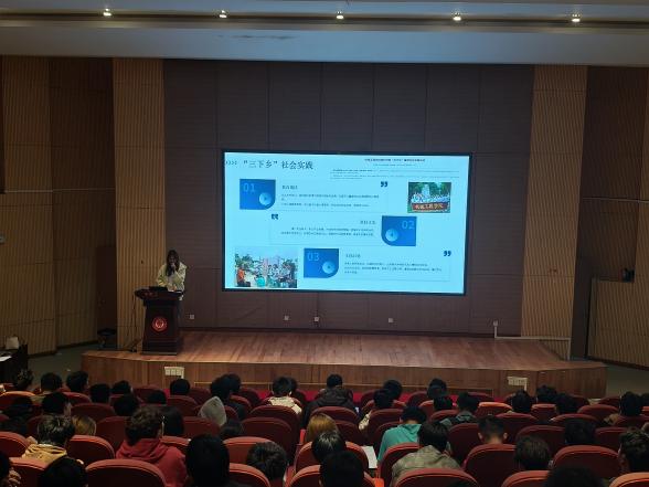 2021级本科生王亚兰、宋润苗从参加社会实践活动意义、自身参与的社会实践具体案例、社会实践活动推荐进行分享,诠释“知行合一”的意义,号召同学们在社会大课堂中锤炼担当。